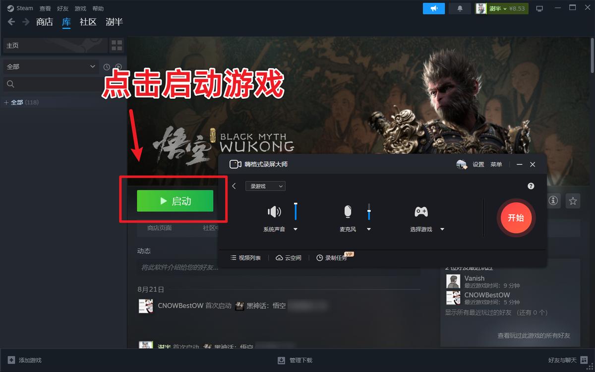 步骤三:等待游戏启动后,确认是否需要录制系统声音、麦克风以及摄像头等内容。点击开始录制即可。